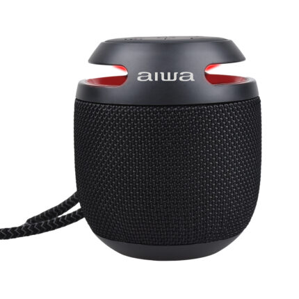 Accessories included: AUX cable 3.5mm to 3.5mm stereo plugs, AIWA Braided Nylon USB Type-C Charging Cable with Leatherette Belt, wrist strap.